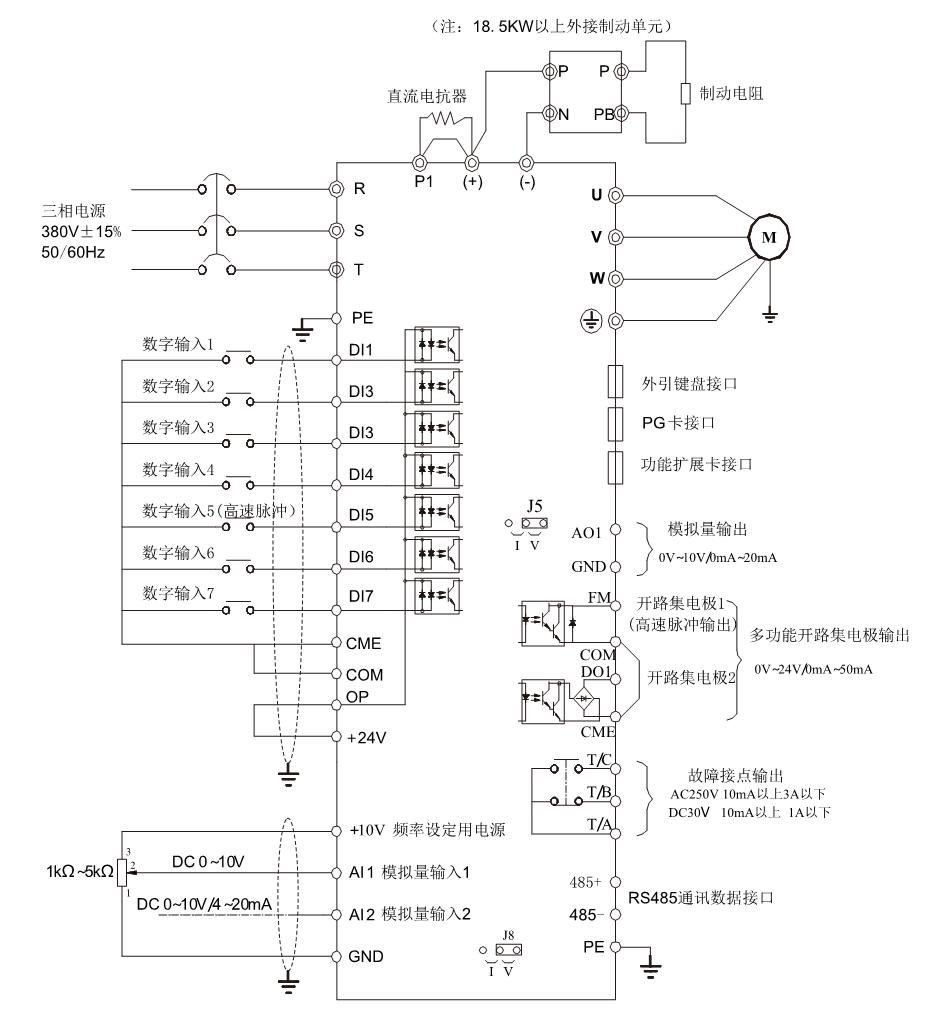7. 多功能继电器输出,实现运转中、频率到达、外部异常等各种状态时继电器输出