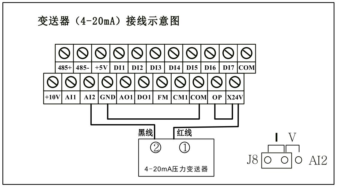 4-20mA变送器反馈模式,需要把绿色端子上的GND和COM用导线短接,变送器的正端接X24V(或者和X24V短接的OP),信号线接AI2。如下图所示。